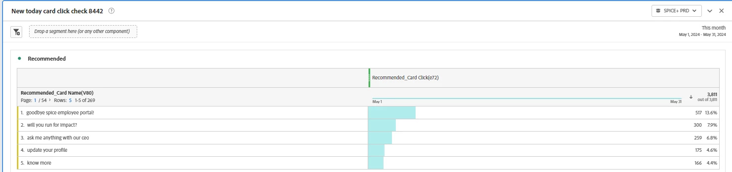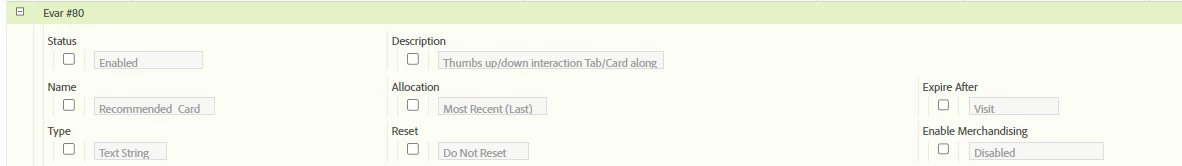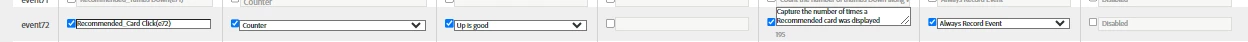 On article clicked we are storing the card names in evar38 and list2 and having event72 to count the click
