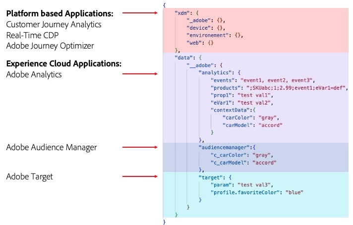 If you are planning for Edge Data Collection and want to migrate existing Experience Cloud solutions to Web SDK, you have a few options when it comes to structuring the data you send. As discussed in a previous blog, data you send to Adobe Experience Platform (AEP) must be sent as XDM and aligned with a dedicated XDM schema. But what if you want to send data to Analytics or Target, but NOT to AEP? For that, you can use the data object, a sibling to XDM in your network call payloads. As described below, the data object has properties that allow for a smooth migration of existing Experience Cloud solutions without requiring that it be associated with an XDM schema.