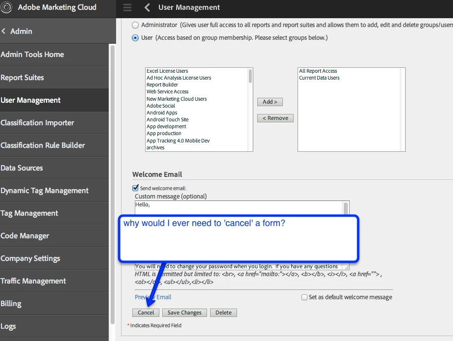 cjpberryLevel 2Forum|Forum|11 years agoFebruary 6, 2015NewEliminate Cancel Button on User Setup PageForum|Forum|11 years agoFebruary 6, 20151 reply665 views I don't understand the use case for this particular button. I understand that it was a design pattern introduced in FrontPage '97. It's really enraging to fill out a form, and then hit the cancel button by mistake. #justsmallthingsAnalytics