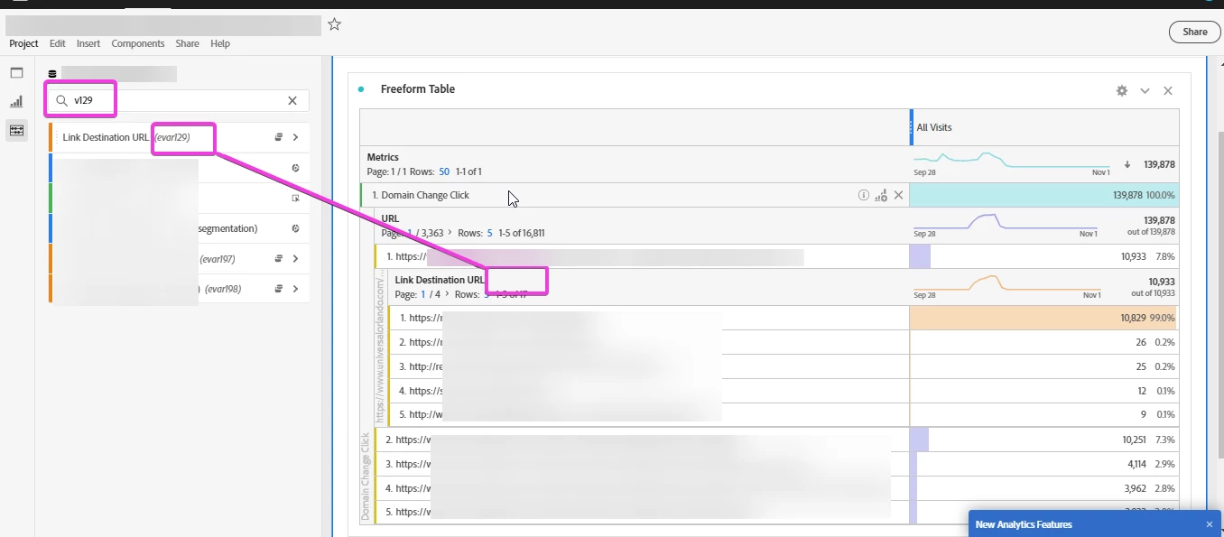In Adobe Analytics Workspace area, the left pane can search these values such as "v129" and shows the hint in parenthesis, but when I view within the breakdown on the right, this hint is not visible.