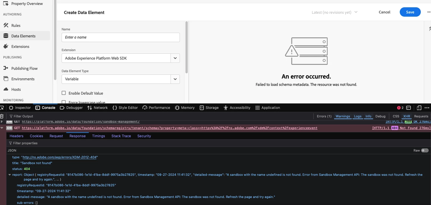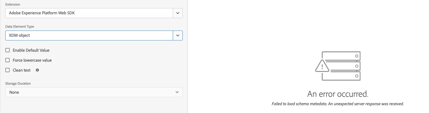 I am currently trying to set-up some basic web tracking with the server-side forwarding and the AEP Web SDK. Following the documentation I managed to create a schema, a Datastream and a Dataset, however I am now faced with an issue where AEP Web SDK Extension in Data Collection doesn't let me create the XDM Object Data Element to map the variables to my schema. After selecting the XDM Object type in the Data Element interface I am presented with the following error: