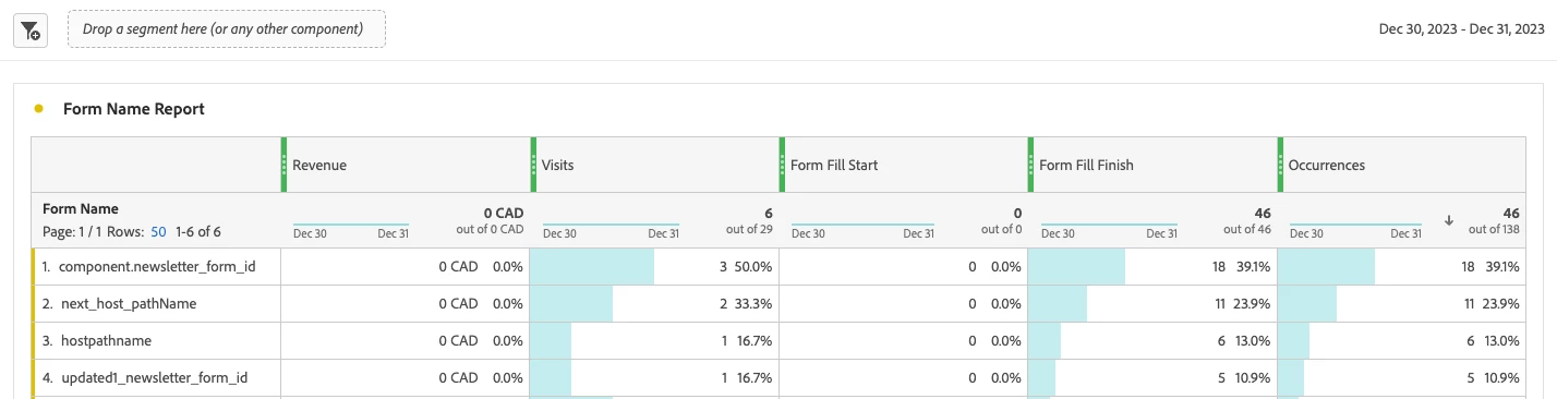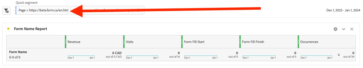 3. But when I add a segment to only see the Form Name from "https://beta.form.ca/en.html", the data are gone. Note that I am using the `Page` dimension as that is where the URL values are being recorded, and I don't have the `Page URL` dimension.