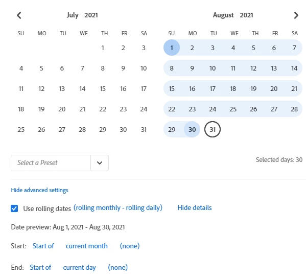 In the date range selector as a cta box, could be in the advanced settings with the 'rolling dates' feature.