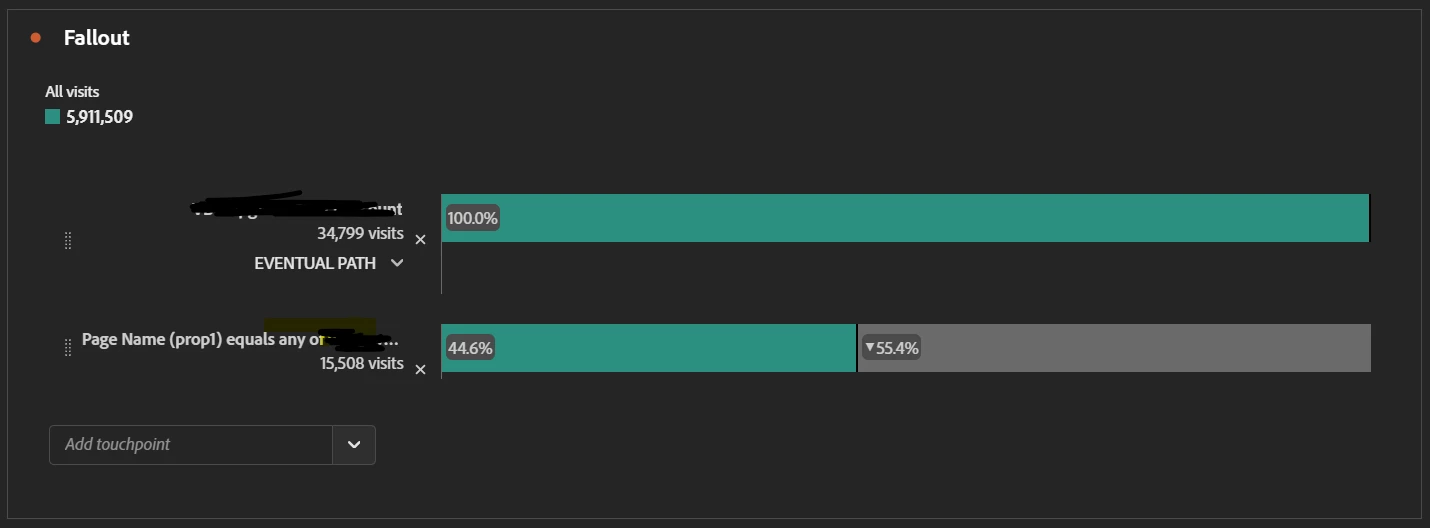 The fallout report has 34799 Visits for a Page A and when they move to Page B they have 15.5k visits.