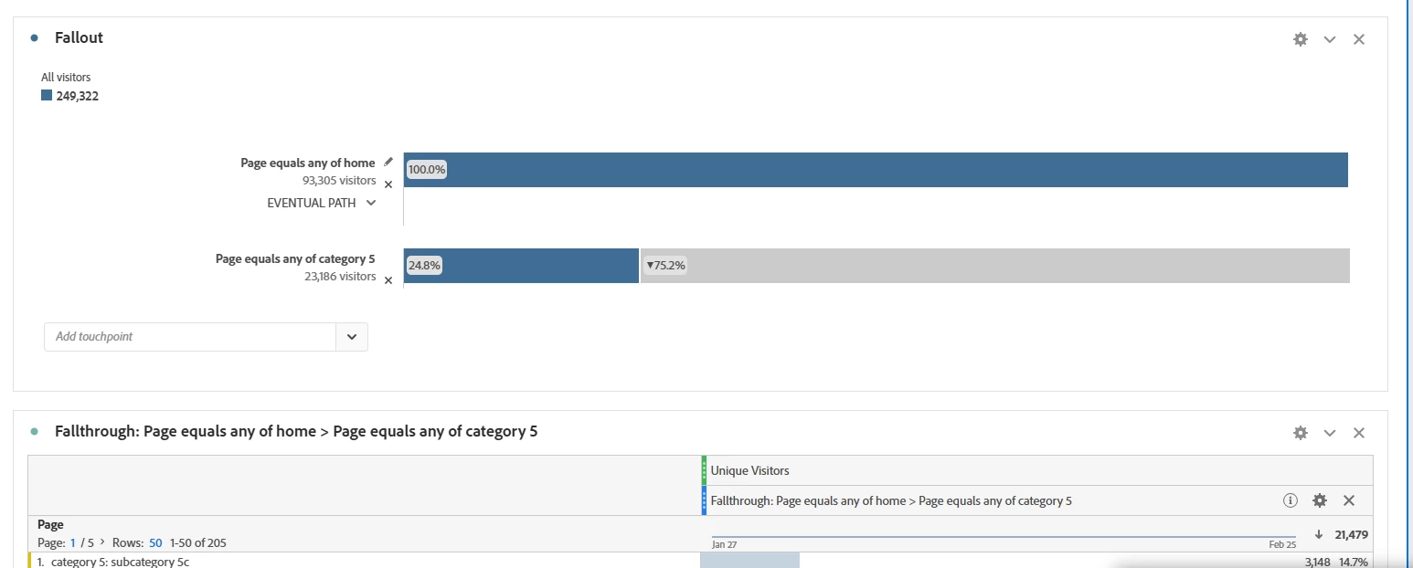 If I have 2 pages on my site and I want to understand where did my visitors go before they reached Page 2 from page 1. So I create a fall out visualization in analytics and use "Breakdown fallthrough at this touchpoint" on Page 1. The number of unique visitors I see on the breakdown table will not be the same as unique visitors on the fall out visual on page 2.