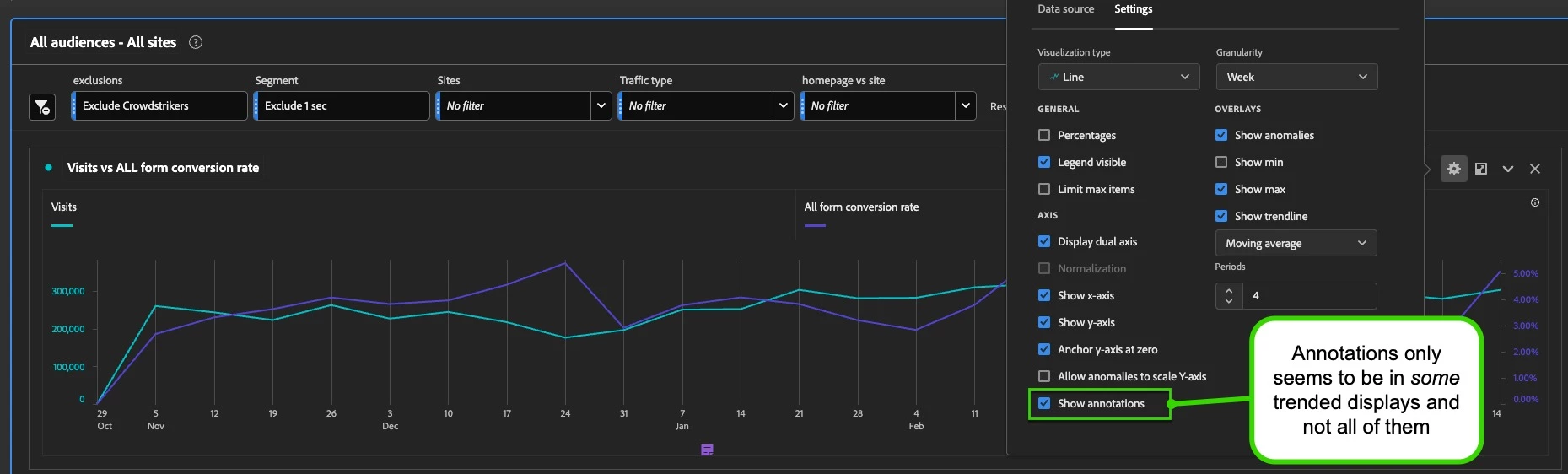 This is a feature request to add annotations in all trended displays in AA and CJA. Right now, I believe I can only see annotations in "line" charts. But I can see that it would be also valuable to see annotations in: