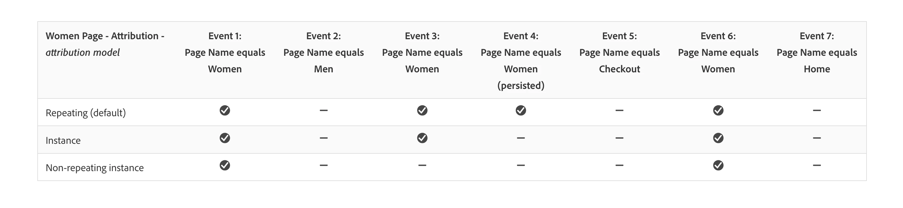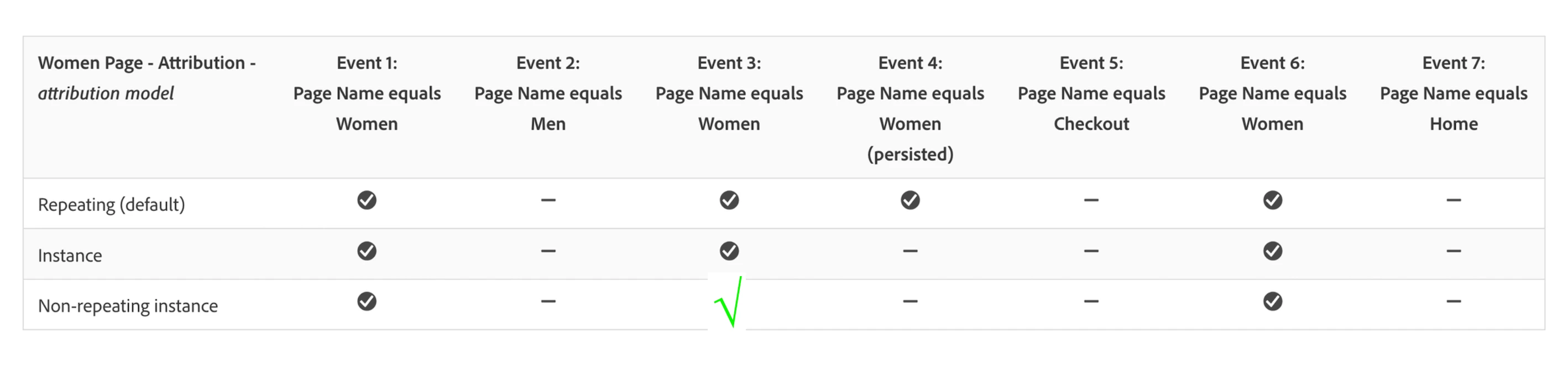 Why isn't Event 4 being recorded? I'm thinking it is a page reload and instances are only counted when there are other pages (or different dimension values) between in the journey? if so perhaps adding that in the explanation to the documentation will make it easier to comprehend.