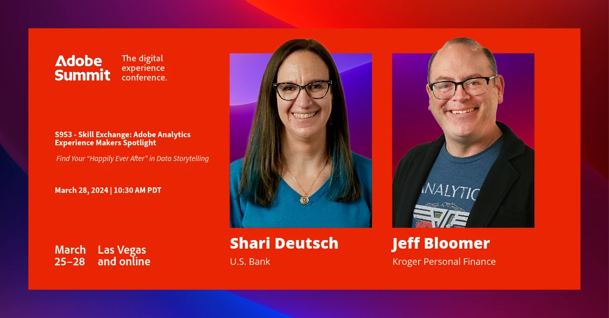 As analysts, we often wish that the numbers would magically weave their own tale! Unfortunately, no amount of pixie dust can bring that fantasy to life. Join us for our Adobe Summit session, Session S953 The Skill Exchange: Adobe Analytics Experience Makers Spotlight, to learn how you can create your own data narrative, no sorcery required. @jeff_bloomer will explain the value of a good story and its power to enhance the quality and impact of your work. @sharilynndeutsch will share the importance of a data style guide and the steps to create one. Whether you’re able to attend Summit in person or are watching the recording later, be sure to come back here on Thursday, March 28th for the full details of our presentation, plus bonus materials!