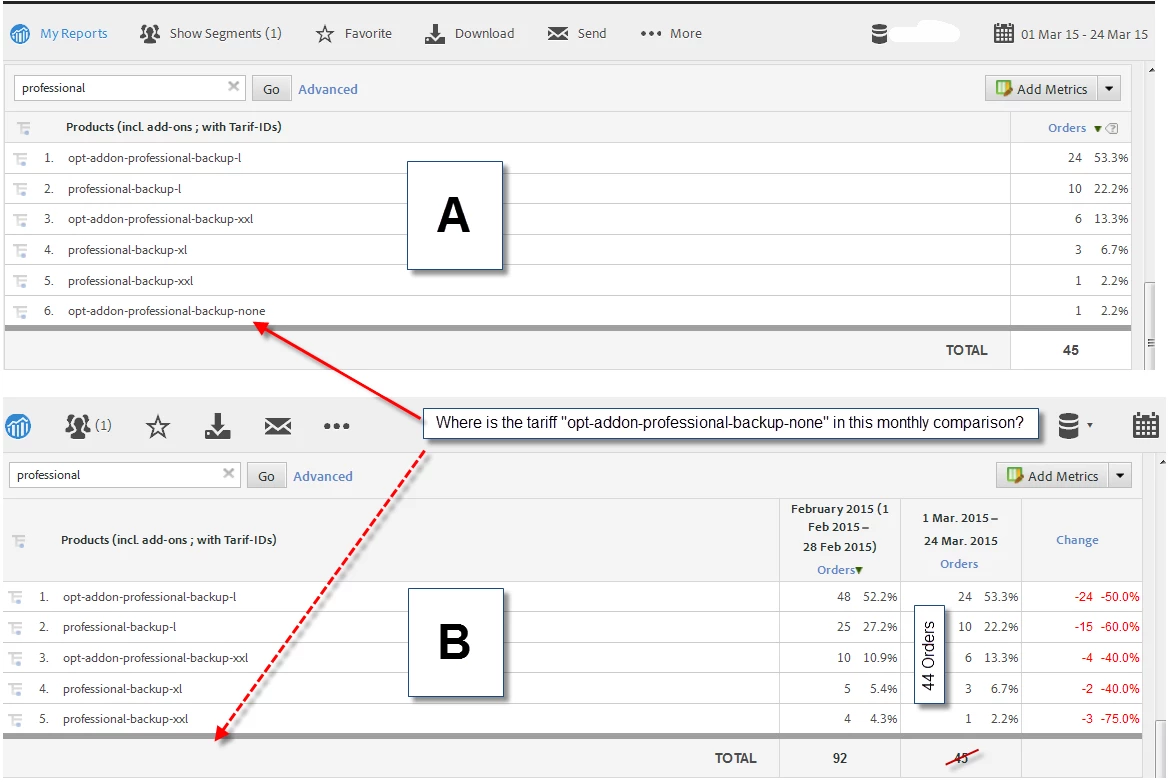 I attached an example, where we compared the orders of a productgroup with 6 tariffs in March. In February, we had just 5 tariffs. In case I compare February and March, the tariff on position 6 doesn't appear, because there are only orders in March for this tariff. I would have expected "0" orders in February and "1" order in March.