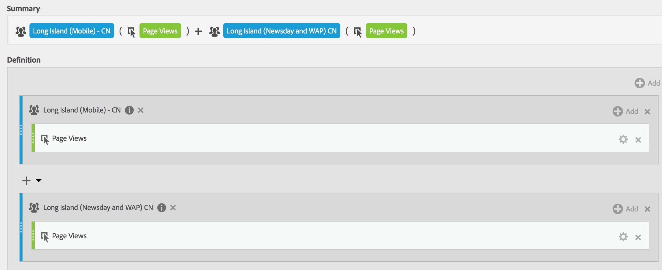 I want reporting for one specific content vertical across three different platforms or reporting suites. So I have three reporting suites, let's call them Suite A, Suite B and Suite C. I also have two segments. Segment 1 applies to Suites A&B, Segment 2 applies to Suite C. So I went to Calculated Metrics and created a metric that combines the factors above (see screenshot.)