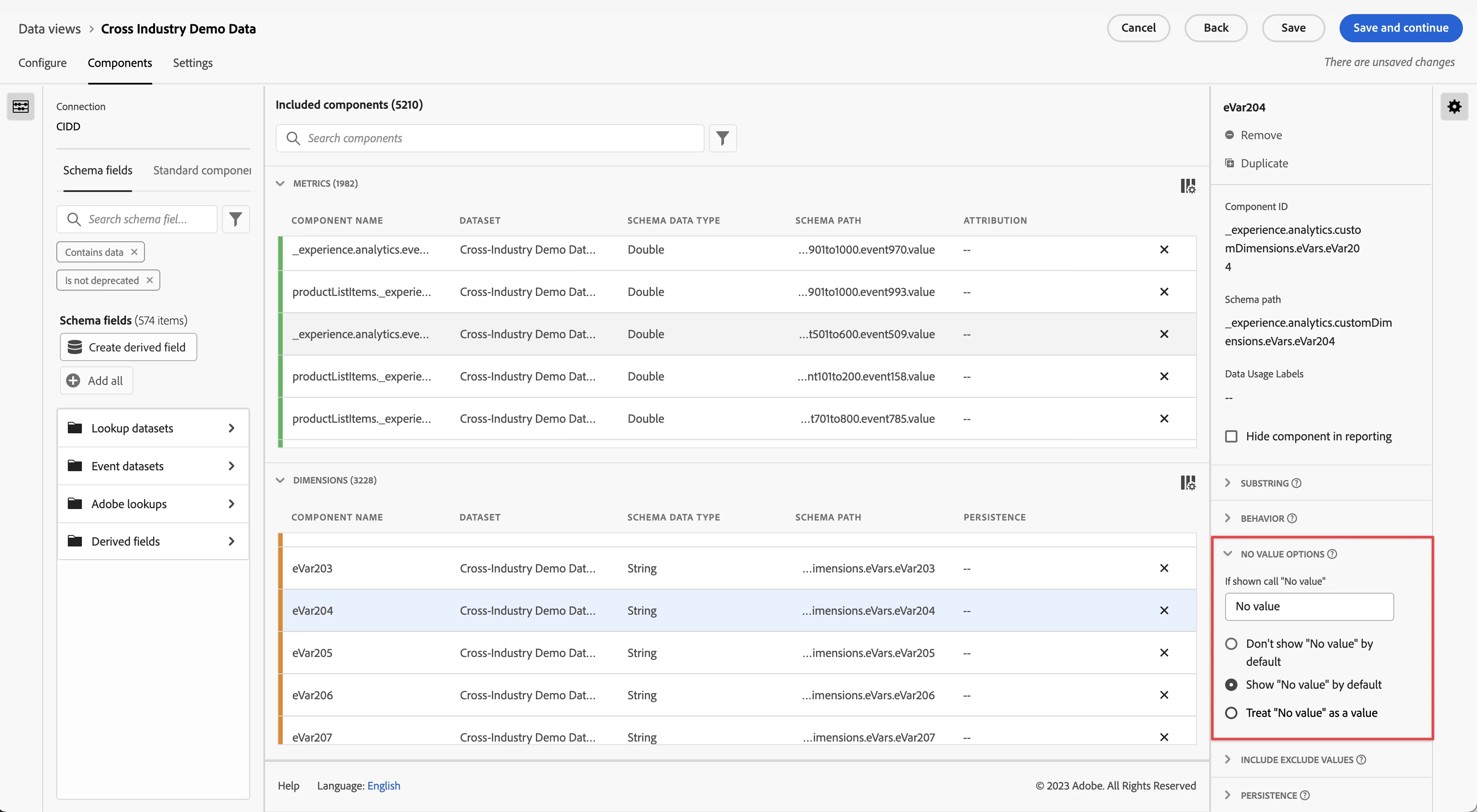 CJA's product capabilities include flexible and highly configurable component settings for handling "No Value" at the Data View level. With CJA, you can specify how "No Value" is displayed in Analysis Workspace reports for each CJA Data View, for each individual component dimension. The dimension-level setting selection handling is also retroactive and non-destructive, in line with CJA Data Views overall. You have various handling options, as outlined in the matrix below: