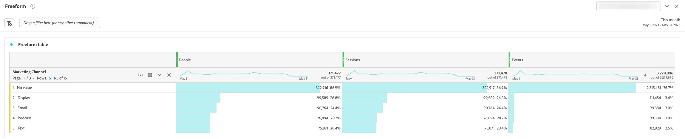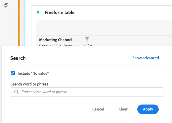 For example, in the CJA Marketing Channel report below, there is a "No Value" line item present. This represents the portion of user traffic generating events that is not explicitly tied to a specific Marketing Channel dimension. The versatility of CJA allows administrators to decide how to handle "No Value" in component settings to aid in comprehension and understanding for all users such as: