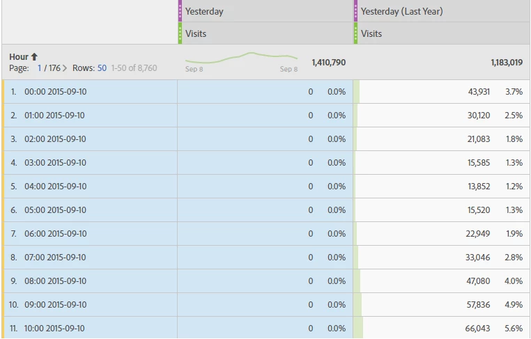 How can I create hourly comparison charts and graphs in workspace? If I pull two different time periods (for example today and yesterday) and want to view the change in visits by hour, how can I pull this? When i pull the hours dimension it contains the date and time, and does not allow me to compare 12pm today vs 12pm yesterday unless i grab the raw numbers themselves. I cant create a segment around numbers, and since the hours dimension is shown that way, I also cannot graph the data in workspace.