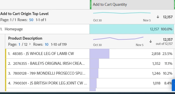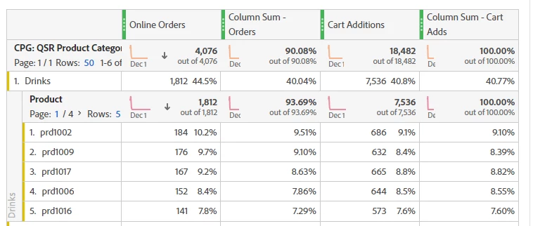 Once you have the metric created, you just add it as a column in your table. I added two examples, the one with the orders from above, and then I also did a cart addition one too. In the regular orders and cart addition columns you can see beside the main number there is a % in there. That is similar to what we just calculated. It shows what percent of the total is coming from each row. The difference between what that is doing and what we calculated is that our calculation doesn't take into account deduplication. You'll notice for cart adds, the small percent and what we calculated are basically the same for each row, that's because you only add one product to cart at a time. But for online orders, you can have more than one product in a particular order. But the metric deduplicates that in the total. The column sum metric ignores the deduplication and sums up all of the values for the calculation. So it will give you a slightly different number.