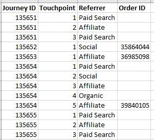 We'd like to be able to see all of the touchpoints (including middle, not just first and last) and the referrer data (channel and URL,etc.) for every consumer journey (ultimately leading to a conversion or not).
