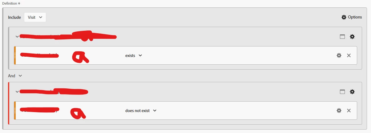 I want to include only visits that have done the first part. I want to exclude every other hit within the visit to get users that only do "a" and nothing else in the visit.