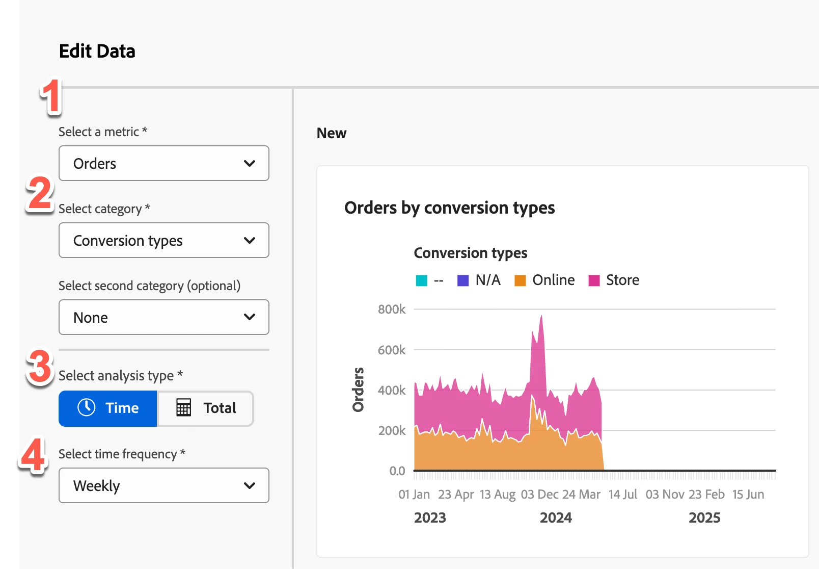 - Select a category breakdown – by selecting Conversion types, I can see if Orders are being populated from each source. For marketing data you’d select your channel field.