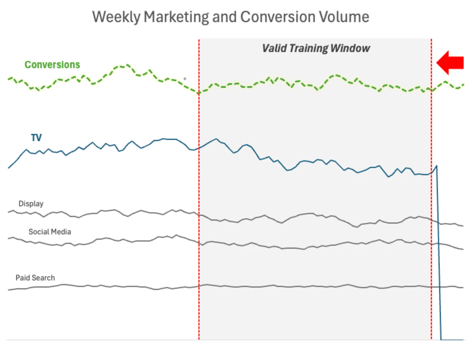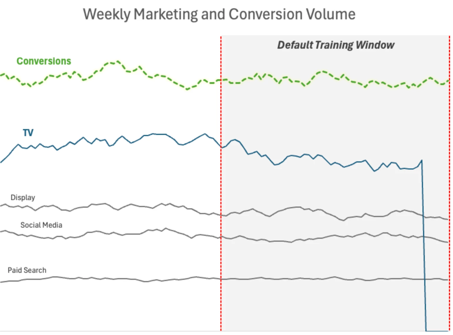The issue is illustrated in the visual below. There are 4 channels and a single conversion. They all have data through the current week, except for TV, which drops off the last few weeks of the date range. The model can see that and conclude that since TV dropped, but Conversions did not drop, TV has no impact on Conversions.