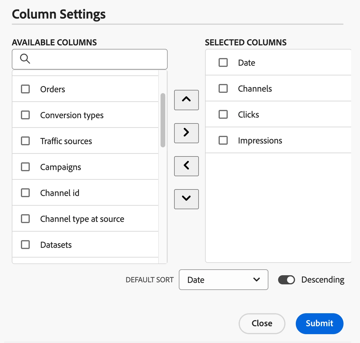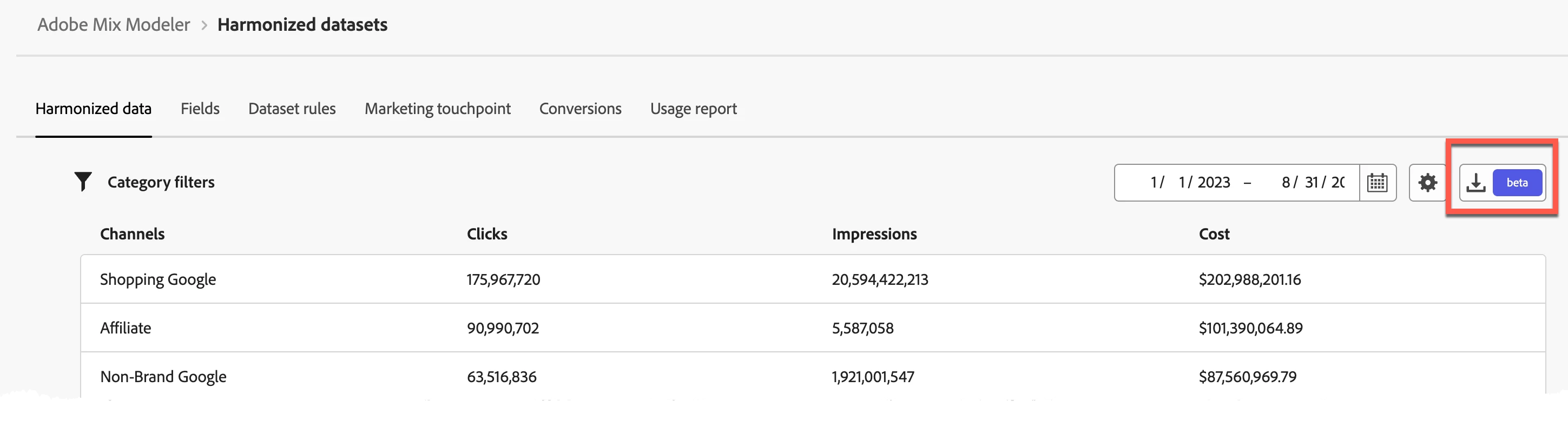 You can also export data and analyze it in Excel. Navigate to the Harmonized data tab in the Harmonized datasets window. From there, adjust the columns you want to include by clicking the gear icon. For your marketing data validation, include ‘Date,’ your channel field, and your channel volume metrics.