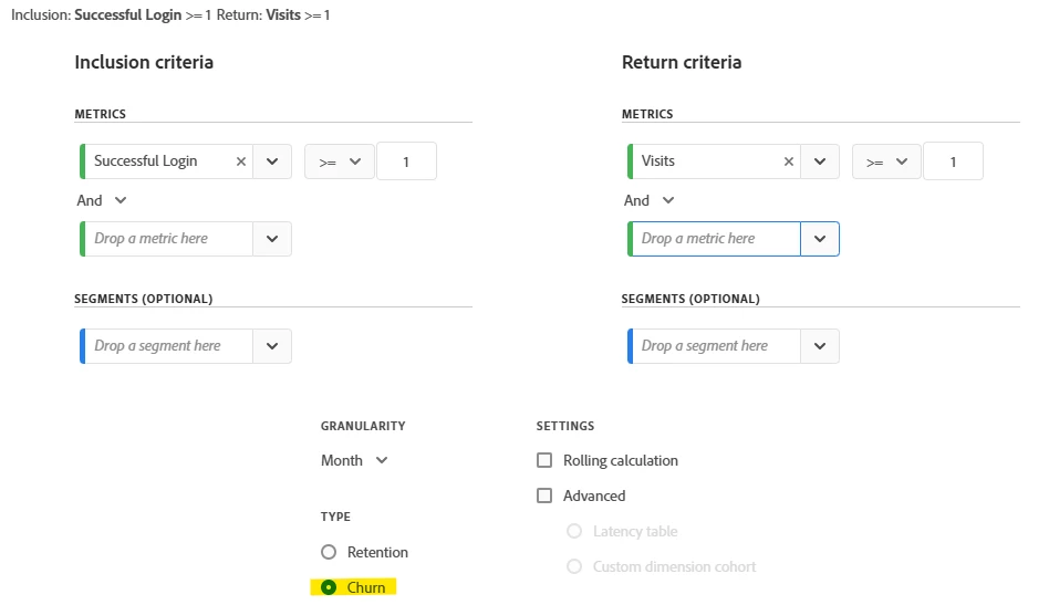 • AND Visitor does not have any Login event after Date Range A (exclude next 30/90 days).