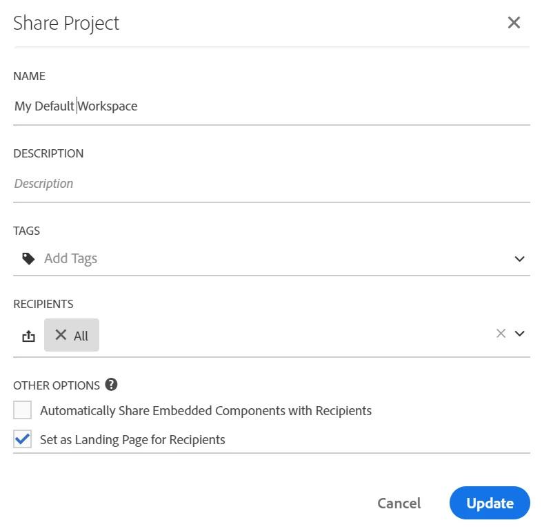 I was looking for this same thing on last month and there isn´t much documentation about it, but the good part is that you can set it as the default landing page to all users directly on the workspace options. To do this open the workspace you want to share and on the menu select the "Share" menu item then select "Share Project" item and on the share settings box that opens at the bottom check the "Set as Landing Page for Recipients" checkbox. Its important to set as recipients the All users option (similar to the screenshot below).