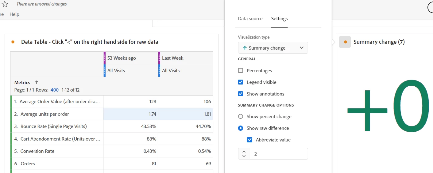 But, if you use the new "Key Metric Summary (which you can't build from a table, but have to add the metrics/segments/etc directly), you can turn off the trend line, and it does show the raw difference in decimal places. You can't turn off the % though, so if you can live with this display, this may be a better option for now... (I would also log an idea to allow for decimal places without abbreviated display to be added to a normal summary change visualization for small numbers)