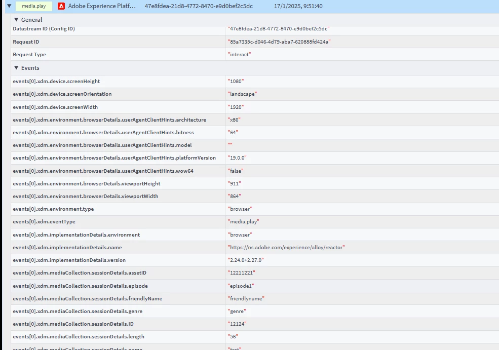 I see this message in the stream: 'com.adobe.media.analytics' however i see data in analytics. but not all of it. is it something related of how I am sending the event? I have enabled the datastream with media analytics. The report suite is enabled too for media.