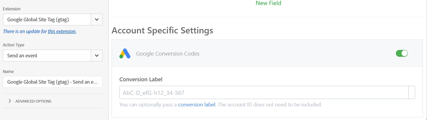 In the extension you set up you Account Id (and give it a name, you can use this extension for GA, Google Floodlight and Google Ads Conversion, the name will help you tell them apart when you add them to your rules)