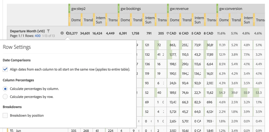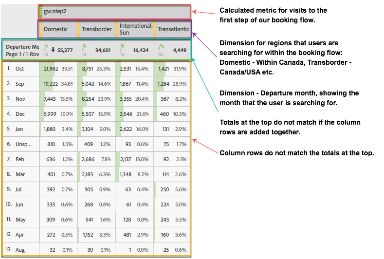mravlich​, the numbers in TOTAL ROW look deduplicated. Click on the gear icon next to the "Departure Mo" dimension and toggle the radio button if you are looking for a SUM.