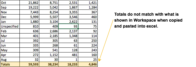 The following image shows the data copied over to excel and you can see that the totals do not match the totals in Workspace: