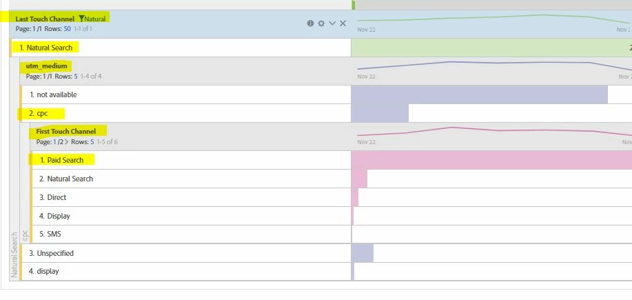 As you can see in below Workspace for Last Touch report, the breakdown containing cpc actually has a First Touch channel of Paid Search but still gets shown as Natural Search in Last Touch - even though it's Paid Search traffic.