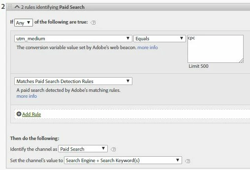 Processing rule for Paid Search - OR condition: utm_medium=cpc or matches Adobe's Paid Search detection