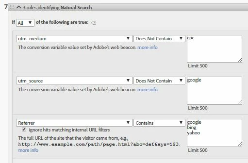 Processing rule for Natural Search / ALL condition: medium does not contain cpc, source does not contain google and referrer contains the main three search engines.