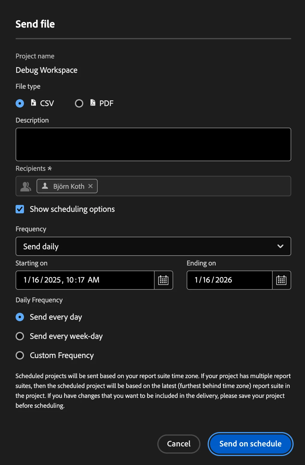 From that landing page, it will have all of your current scheduled projects. Click on the name of the one that you want, and it will open up the editor. This will have all of the populated fields, such as when the report is being sent and who it is being sent to. There you will be able to see everyone on the recipient list, and if needed, you can update the list there too.