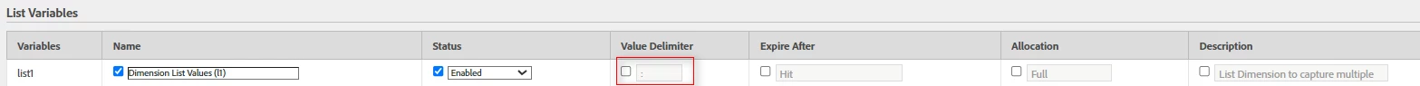 Please ensure that the List variable is configured in the Report Suite settings with the specified delimiter for this scenario, as shown below
