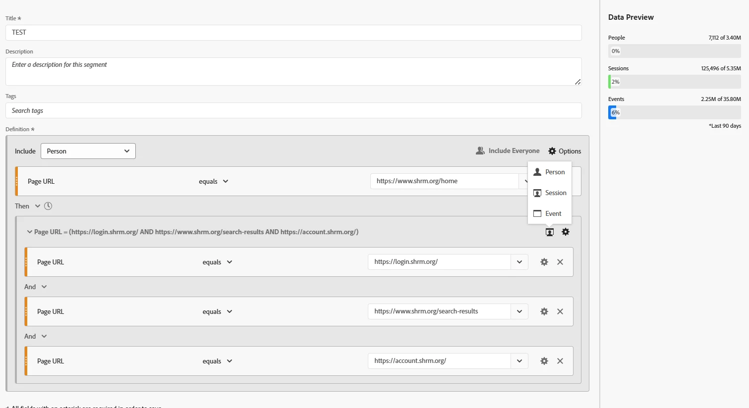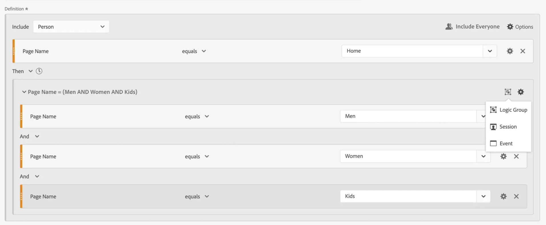 I wanted to experiment with the Logic Group container. I basically replicated segmentation grouping used in the documentation, but my container is only showing the standard Person, Session, Event container settings. Am I doing something wrong here?