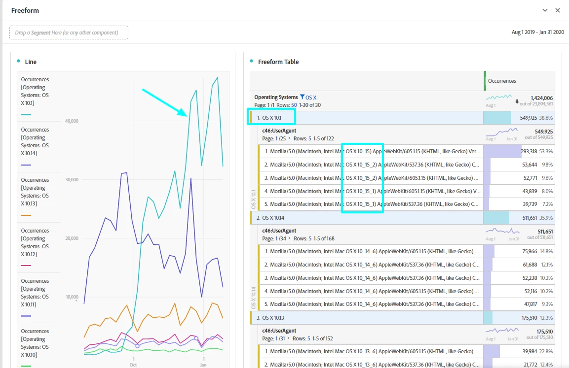 I found "MacOS 10.1" visitors increasing unnaturally, and its "User Agent" values, cross-tabed prop, includes "Mac OS X 10_15".