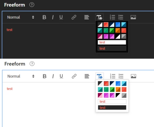 As pointed out in https://experienceleaguecommunities.adobe.com/t5/adobe-analytics-questions/multiple-black-colours-when-using-colour-palette-in-text/td-p/590810 Some of the colour options available in the colour pallet work well for Light Mode and not for Dark Mode... since Light/Dark mode is left to each user to choose, it can be hard to ensure that descriptions and notes are properly visible.