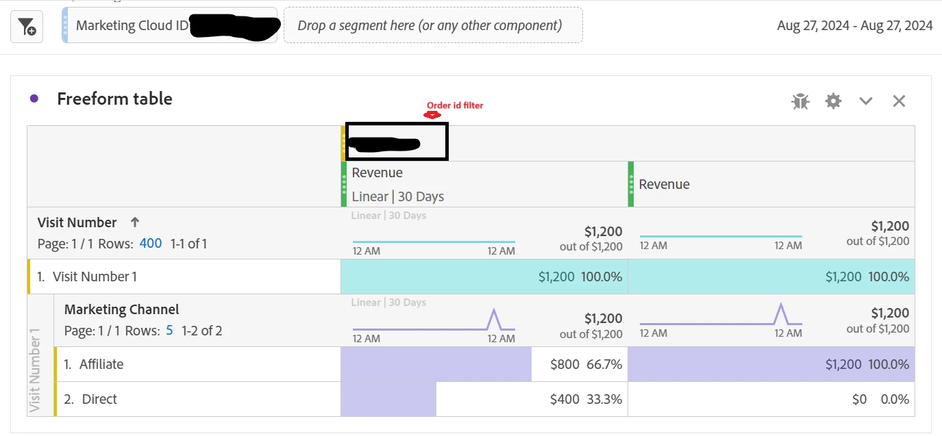 The reason is because for your metric 'revenue', you have the attribution set to 'linear'. The definition from Adobe's documentation about linear allocation is: Gives equal credit to every touch point seen leading up to a conversion.