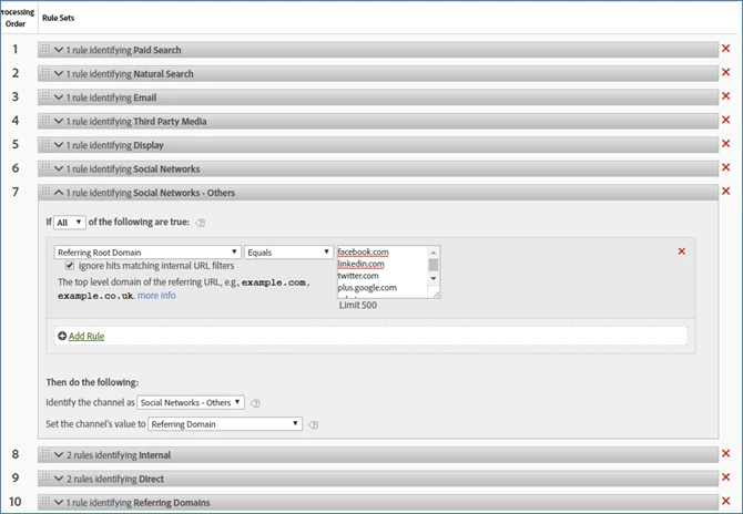 I have the Marketing Channel Overview Report set up with rules in the screenshot below, with Facebook.com and Instagram.com being under the "Social Networks - Others". However, I am seeing a "l.instagram.com" conversion (under First Touch and Last Touch) and "m.facebook.com" conversion (under First Touch) both under "Referring Domains" instead of "Social Network - Others".