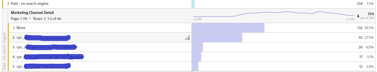 Now, my Paid Search bucket seems to be working fine (as well as every other channel) catching only correct values (Search engine + keyword), however, the Paid - no search engine is acting really weird. As shown on the screenshot above, one of the defining rule is that the cid must begin with cpc, therefore I assume there should always be a query string parameter present when this channel is broken down by Marketing Channel Detail dimension. Nonetheless, this is not the case and the value "None" still appears in the report: