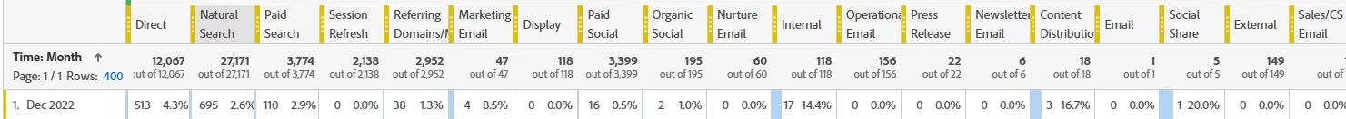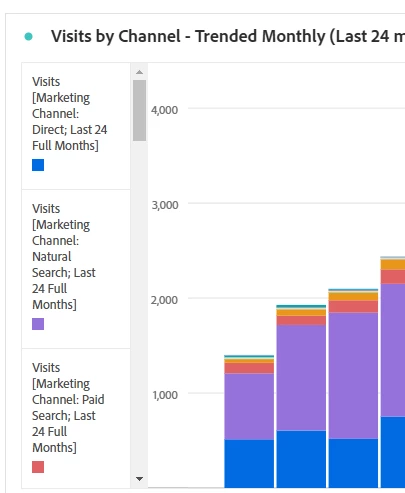 Hi! I am working on dashboards for my marketing organization. I run into issues while creating different visualizations based on marketing channel data. For example, in the below donut chart, Natural Search is blue due to it having the highest volume of visits. However, when I create a bar chart that shows visits x channel x month, Direct is blue because of how the freeform table has to be set up for that specific visualization. This can be pretty confusing for my team members who use this reporting. Is there a way to lock the order of these channels so that no matter what page/date range users are looking at the marketing channel legends stay aligned?
