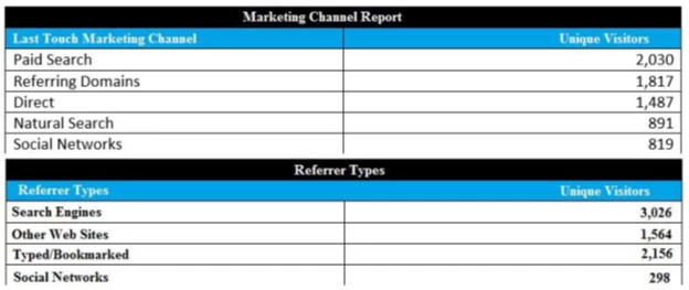 The analyst has been two separate reports that provide differing measurements of unique visitors. The reports were generated with Report. These differing values are in the attached exhibit. Why are the unique visitors of the “Typed/ Bookmarked” Referrer type in the “Referrer Types” report unique visitors of the “Direct” channel in the Last Touch Marketing Channel Report different?