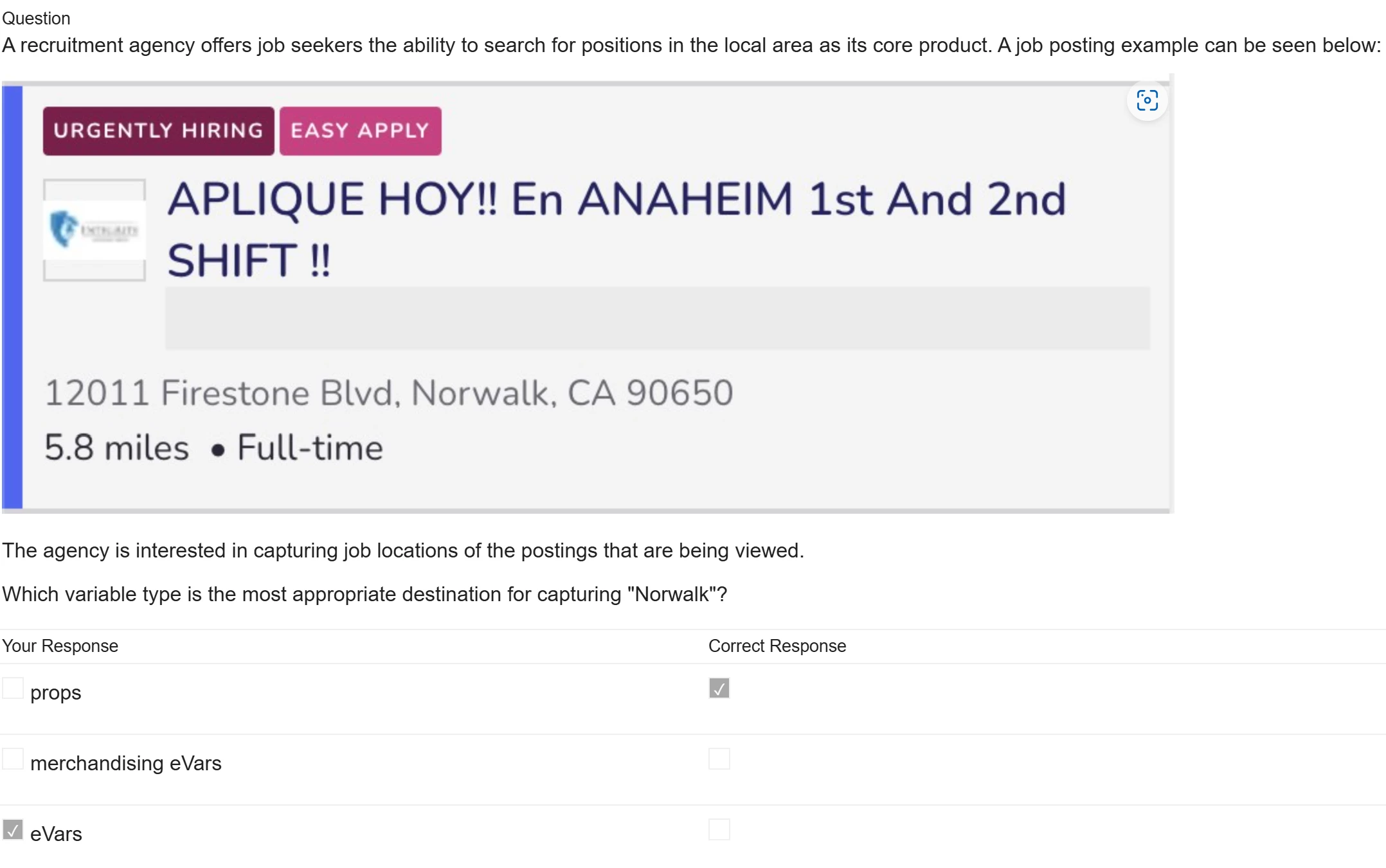 Now, you might be thinking... did she say "all three"... indeed I did....Now, this is something I wouldn't expect on a test, or for the limitation of a test to understand, but I might be tempted to track all my "postings" using s.products... so that I can correlated ALL the postings returned in a search result, with their specific values (i.e. Merchandising eVars), then use the same products notation with different events on the detail page. Then I could also correlate "conversion syntax" variables collected on the search to the "Apply Now" action...