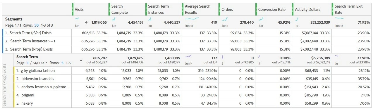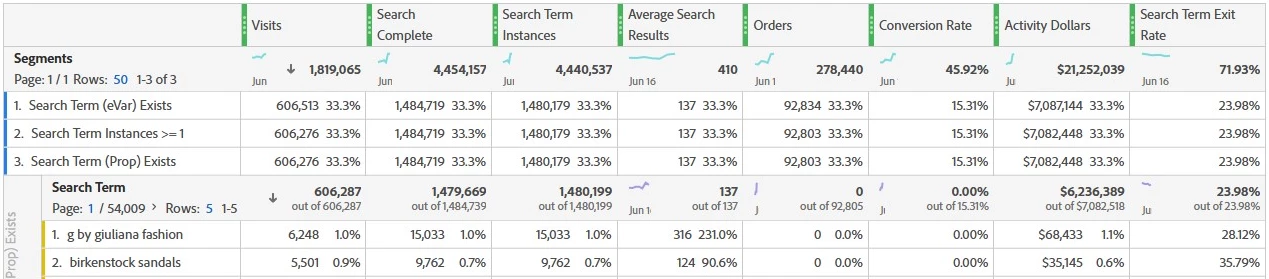We are having an issue with AA returning different numbers for a few of our metrics when you create a segment which says does a search term exist ($7.0M) and when you create a report with search terms ($6.2M).