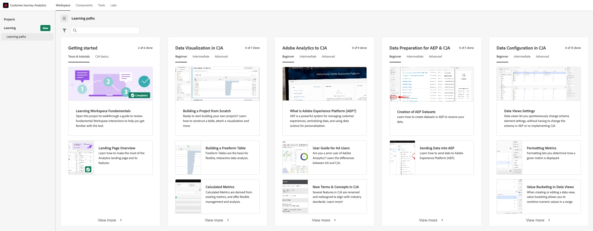 Within CJA, there is a dedicated learning path area that can be accessed by navigating to the "Learning" option located under the "Workspace" tab in CJA's user interface. This dedicated learning path area is designed to cater to users with varying experience levels and roles, providing them with content that is specifically tailored to their needs. In this area, users have the ability to search, sort, and filter content based on its type and their own experience level, ensuring that they can find the most relevant and suitable resources. Furthermore, the learning path area boasts a user-friendly and streamlined navigation and interface, allowing users to conveniently view a larger amount of content and cards simultaneously. Additionally, users can keep track of their progress within the learning path area, ensuring that they can easily monitor their learning journey and accomplishments.