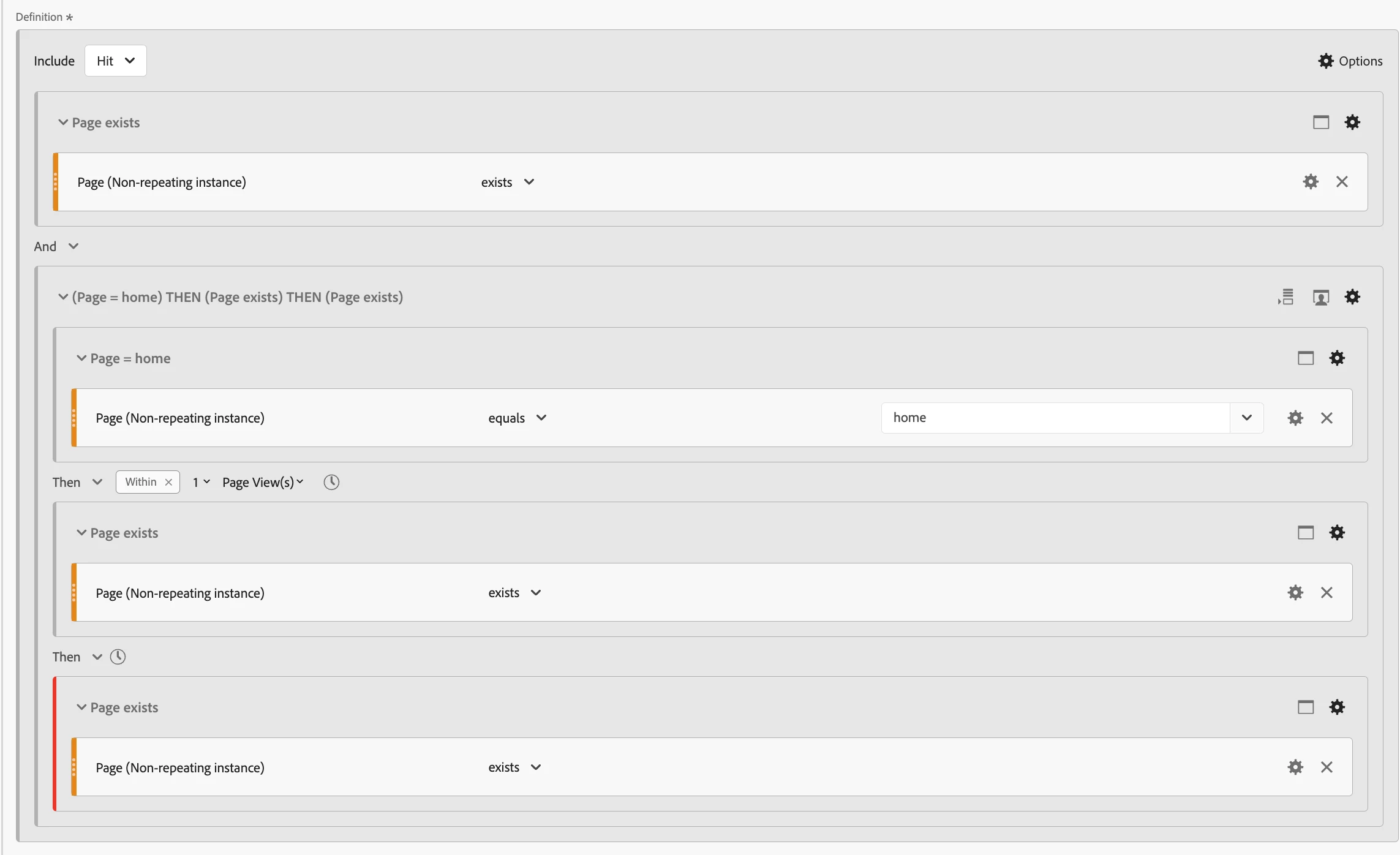 What is the reason for adding an exclusion rule at the end (exclude hits where Page exists) and why do we need to apply the "only after sequence", of the Next Page panel segment? I created a segment using Page as dimension and Home as value. What is the difference if I do not apply either of the two?