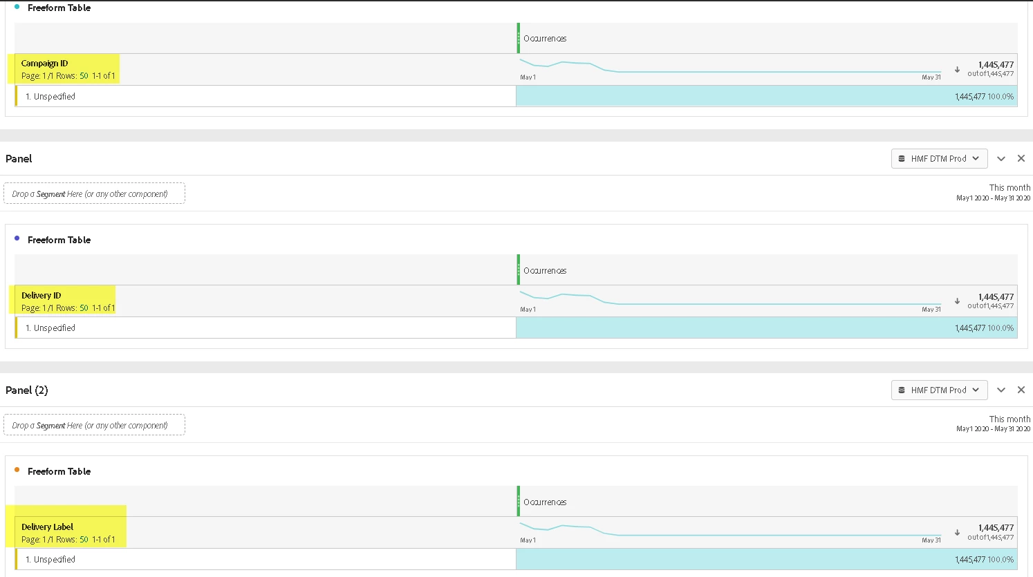 The 'Adobe Campaign Executed Delivery ID' dimension is the only Campaign dimension that I see data. The other dimension (Campaign ID, Delivery Label, etc.) are all under 'unspecified'.