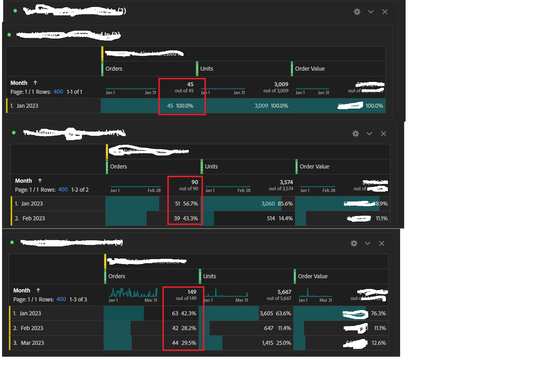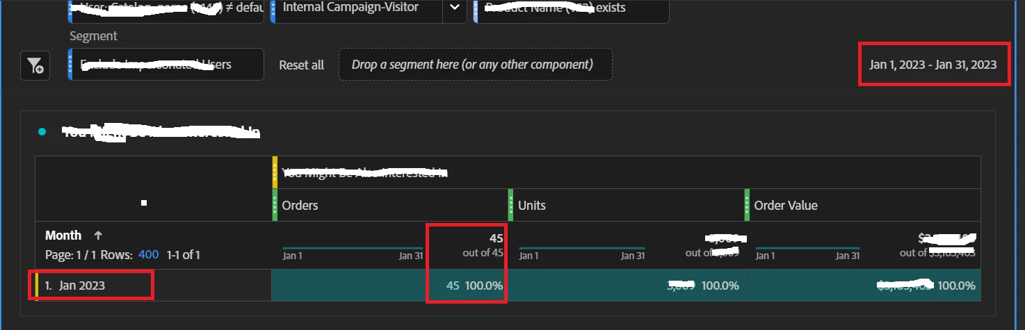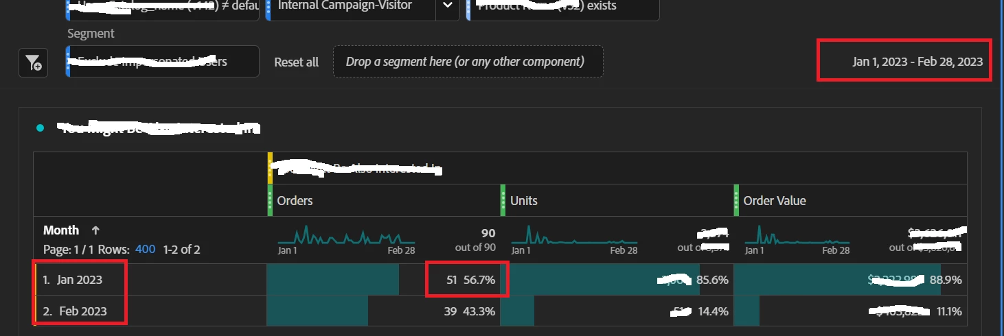 - Looking at Month 1 AND 2, now that the user matches the criteria, all orders for this user (and all the user pages, actions, etc) are being returned, which also changes the Month 1 part of the report.