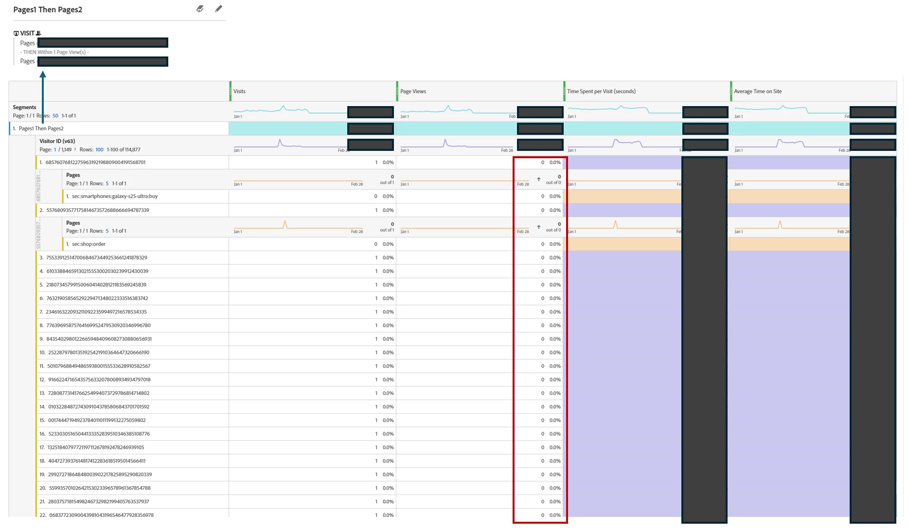 I created the "Pages then Pages" segment, but why does it show only one page when I break it down by Pages after filtering by Visitor ID?